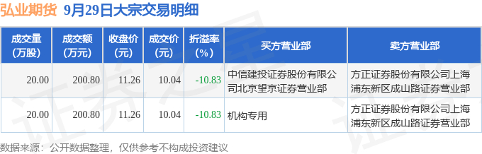 9月29日弘业期货现2笔折价10.83%的大宗交易 合计成交401.6万元