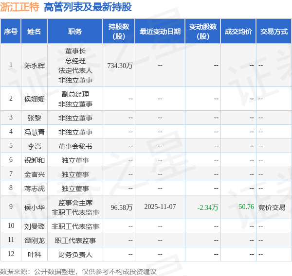 浙江正特的高管列表及最新持股情况如下: