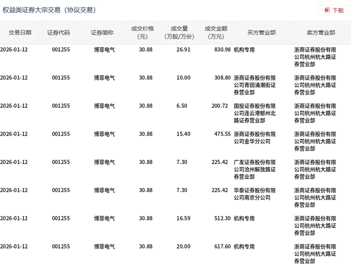 1月12日,博菲电气大宗交易成交110万股,成交额3396.79万元,占当日总成交额的15.18%,成交价30.88元,较市场收盘价37.71元折价18.11%。
