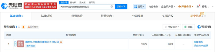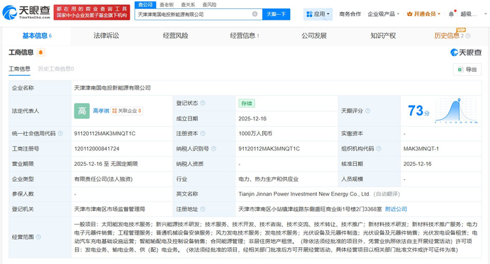 雷达财经讯,天眼查App显示,近日,天津津南国电投新能源有限公司成立,法定代表人为高孝祺,注册资本1000万人民币,经营范围包括太阳能发电技术服务、新兴能源技术研发、新材料技术推广服务、电力电子元器件销售等。股东信息显示,该公司由国家电投集团天津电力有限公司全资持股。