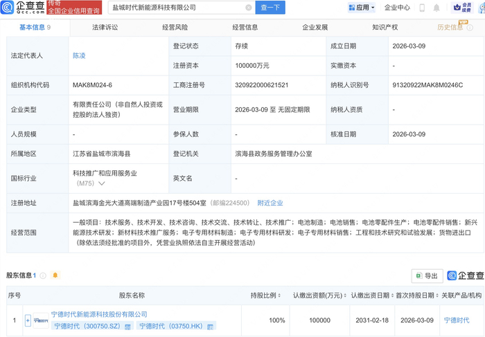 企查查APP显示,近日,盐城时代新能源科技有限公司成立,注册资本10亿元,经营范围包含:电子专用材料制造;电子专用材料研发;电子专用材料销售;工程和技术研究和试验发展等。企查查股权穿透显示,该公司由宁德时代(300750)全资持股。