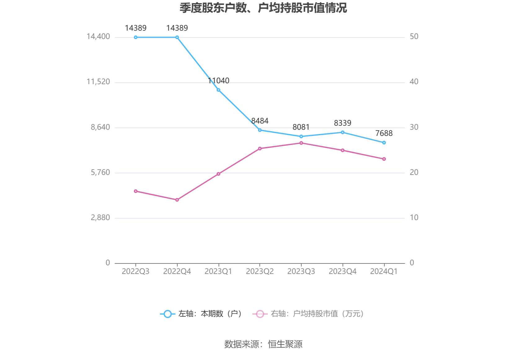 筹码集中度方面,截至2024年一季度末,公司股东总户数为7688户,较上年末下降了651户,降幅7.81%;户均持股市值由上年末的24.99万元下降至23.07万元,降幅为7.68%。