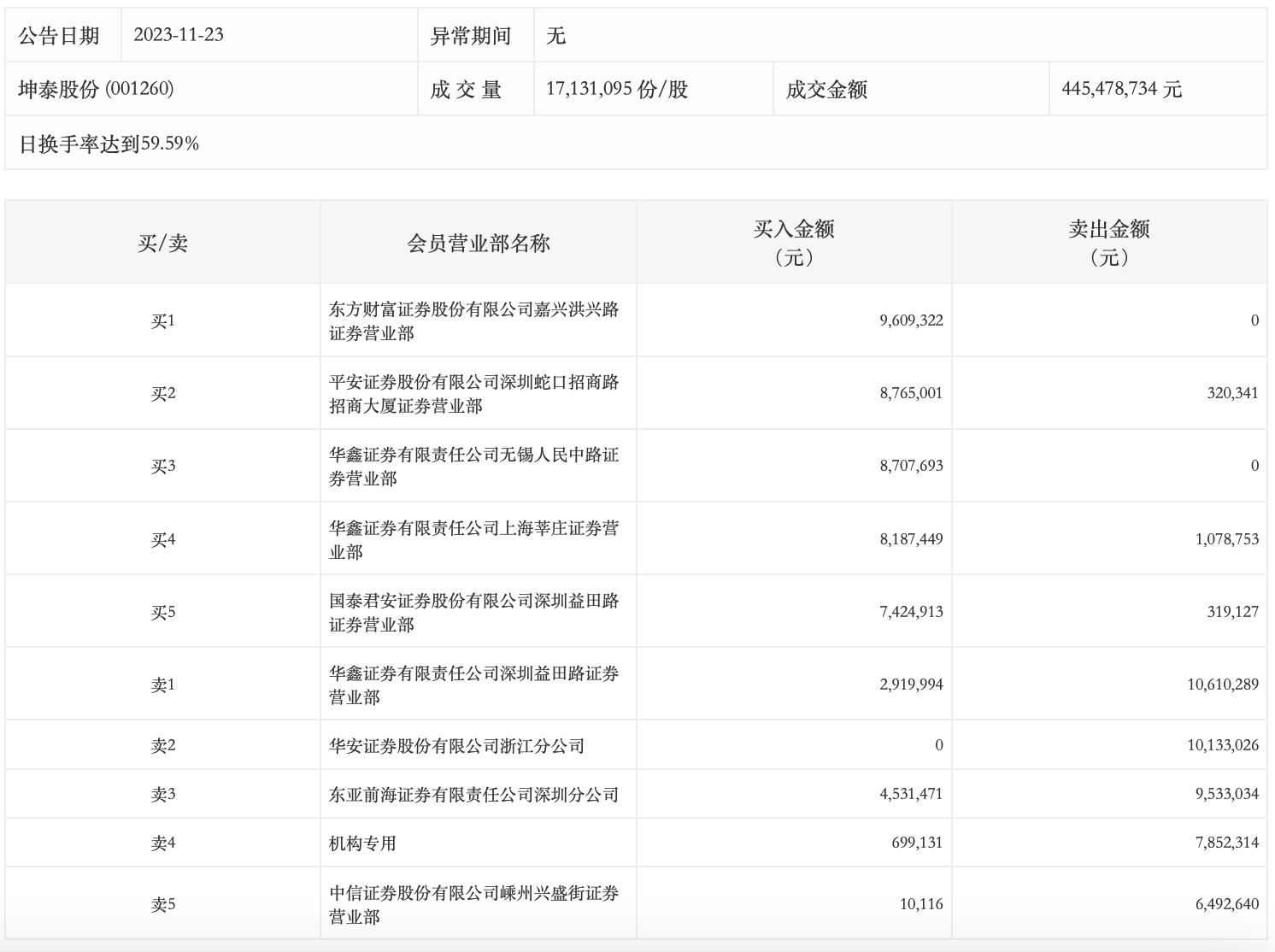 11月23日,坤泰股份今日跌9.45%,全天换手率达59.59%,振幅达12.47%。龙虎榜数据显示,营业部席位合计净买入451.56万元。其中,机构买入69.91万元,卖出785.23万元,合计净卖出715.32万元。此外,华鑫证券深圳益田路证券营业部、华安证券浙江分公司分别卖出1061.03万元、1013.30万元;东方财富证券嘉兴洪兴路证券营业部、平安证券深圳蛇口招商路招商大厦证券营业部分别买入960.93万元、876.50万元。