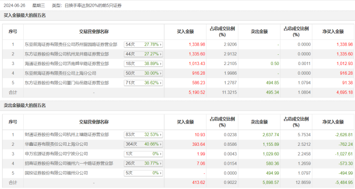 具体来看,知名游资现身龙虎榜,东亚前海证券苏州留园路证券营业部、章盟主(东方证券杭州龙井路证券营业部)分别买入1338.98万元、1335.60万元;财通证券杭州上塘路证券营业部、华鑫证券上海分公司分别卖出2637.74万元、1155.89万元。