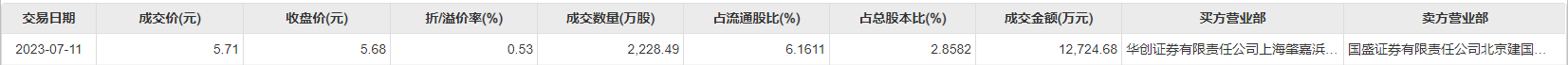 7月11日大宗交易成交2228.49万股,成交额1.27亿元,占当日总成交额的88.52%,成交价5.71元,较市场收盘价5.68元溢价0.53%。