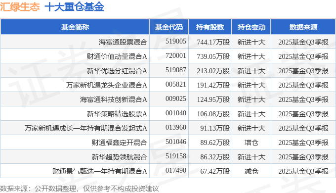 持有汇绿生态最多的基金为海富通股票混合,目前规模为23.1亿元,最新净值1.5366(10月29日),较上一交易日上涨1.21%,近一年上涨76.64%。该基金现任基金经理为吕越超。