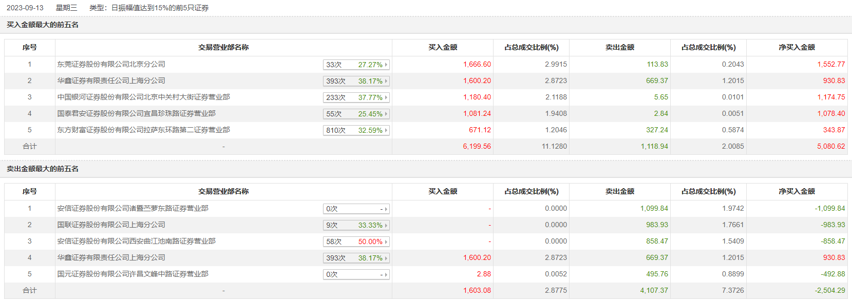 具体来看,知名游资现身龙虎榜,著名刺客(东莞证券北京分公司)、华鑫证券上海分公司分别买入1666.60万元、1600.20万元;安信证券诸暨苎萝东路证券营业部、国联证券上海分公司分别卖出1099.84万元、983.93万元。