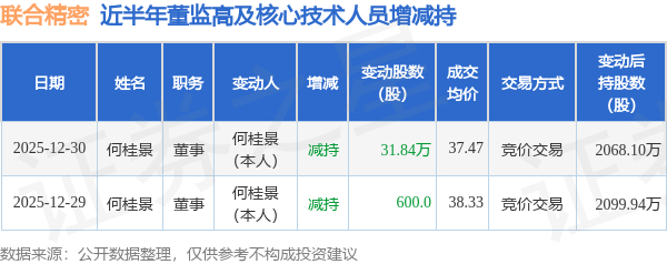 证券之星消息,根据12月31日市场公开信息、上市公司公告及交易所披露数据整理,联合精密(001268)最新董监高及相关人员股份变动情况:2025年12月30日公司董事何桂景共减持公司股份31.84万股,占公司总股本为0.295%。变动期间公司股价下跌0.13%,12月30日当日收盘报37.42元。