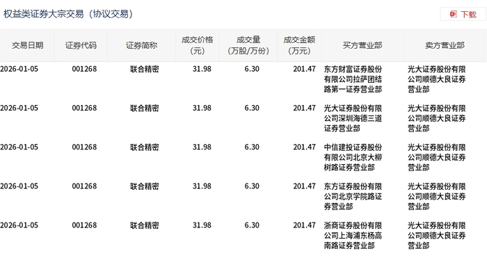 1月5日,联合精密大宗交易成交31.5万股,成交额1007.35万元,占当日总成交额的10.39%,成交价31.98元,较市场收盘价35.96元折价11.07%。