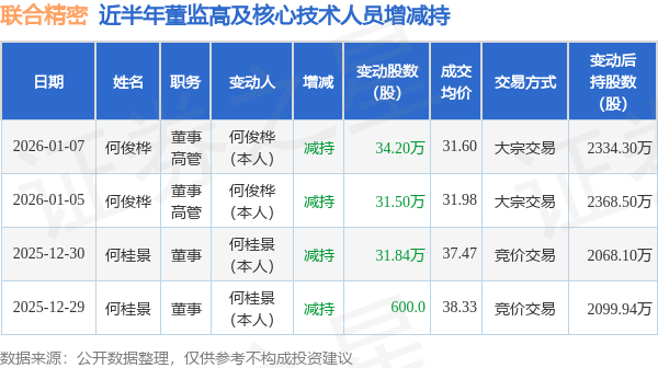 联合精密:1月7日高管何俊桦减持股份合计34.2万股