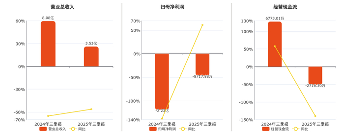 公司营业总收入为3.53亿元,在已披露的同业公司中排名第64,较去年同报告期营业总收入减少4.55亿元,同比较去年同期下降56.36%。归母净利润为-8717.88万元,在已披露的同业公司中排名第44。经营活动现金净流入为-2716.30万元,在已披露的同业公司中排名第41,较去年同报告期经营活动现金净流入减少9489.32万元,同比较去年同期下降140.10%。