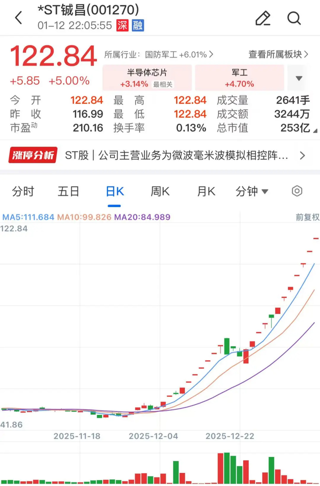 *ST铖昌是近期商业航天板块的大牛股,该股股价自去年12月1日以来出现大幅拉升,至今累计涨幅达177%,近11个交易日收获10个涨停板。截至停牌前,该股报收122.84元/股,总市值为253.2亿元。