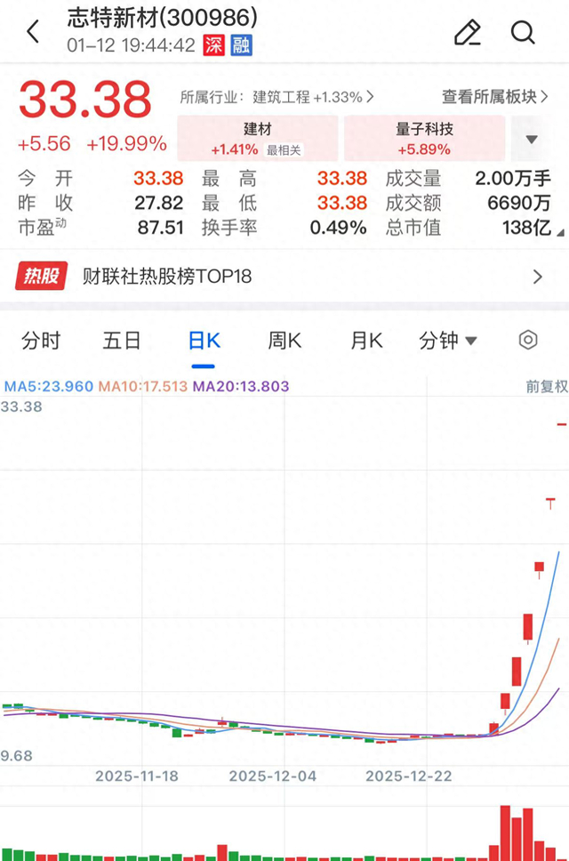 志特新材是今年A股市场最牛个股,今年的前6个交易日,该股全部收获20CM的涨停,也是今年首只翻倍股。截至停牌前,志特新材今年累计涨幅198.6%,股价报收33.38元/股,总市值达137.5亿元。