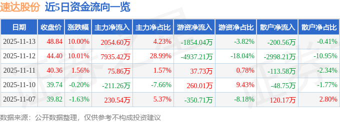 证券之星消息,速达股份11月13日涨停收盘,收盘价48.84元。该股于9点32分涨停,2次打开涨停,截止收盘封单资金为4.28亿元,占其流通市值19.31%。