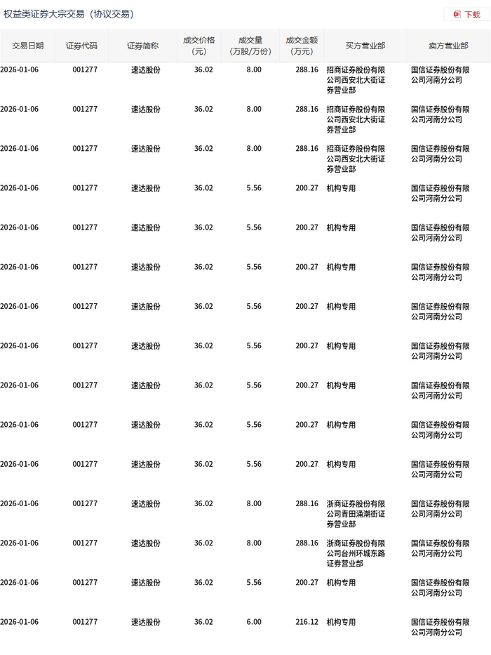 1月6日,速达股份大宗交易成交96.04万股,成交额3459.35万元,占当日总成交额的36.01%,成交价36.02元,较市场收盘价40.6元折价11.28%。