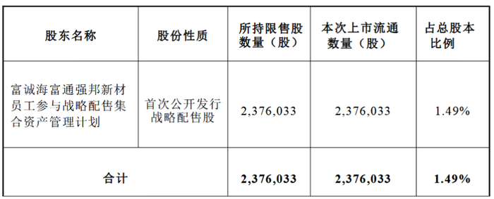 9月29日,强邦新材(001279)发布公告,238万股将于2025年10月13日上市流通,上市流通数量等于该限售期的全部战略配售股份数量。具体情况如下: