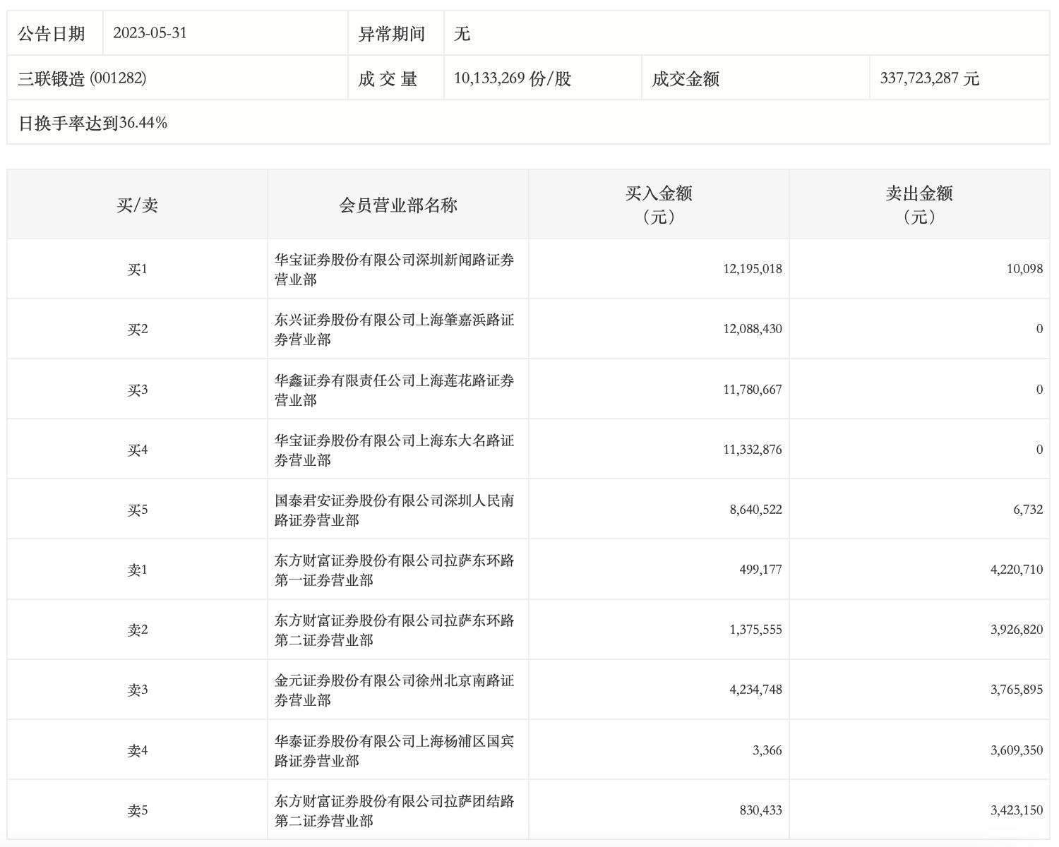 5月31日,三联锻造今日涨停,龙虎榜数据显示,上榜营业部席位全天成交8194.35万元,占当日总成交金额比例为24.26%。其中,买入金额为6298.08万元,卖出金额为1896.28万元,合计净买入4401.8万元。