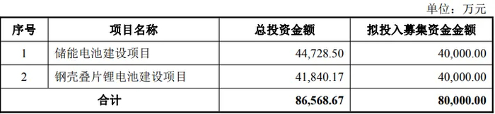 具体来看,此次募投项目中的储能电池建设项目总投资额为4.48亿元,拟使用募集资金投入4亿元,建成达产后将形成年产约3GWh储能电芯产能,重点满足户用储能及工商业储能等场景的电池产品需求。