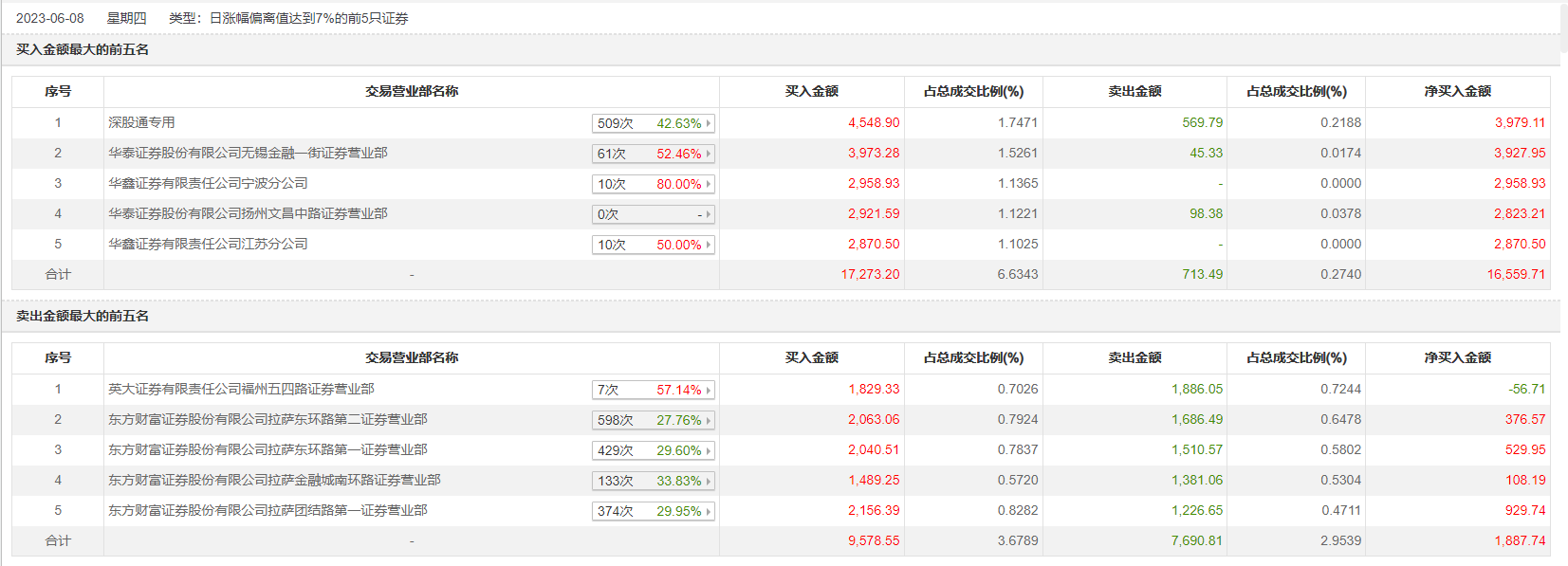 具体来看,深股通专用、华泰证券无锡金融一街证券营业部分别买入4548.90万元、3973.28万元;英大证券福州五四路证券营业部、东方财富证券拉萨东环路第二证券营业部分别卖出1886.05万元、1686.49万元。