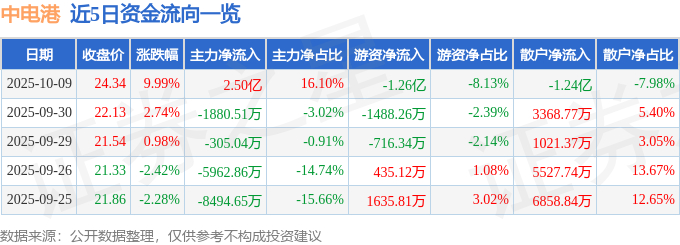 10月9日的资金流向数据方面,主力资金净流入2.5亿元,占总成交额16.1%,游资资金净流出1.26亿元,占总成交额8.13%,散户资金净流出1.24亿元,占总成交额7.98%。