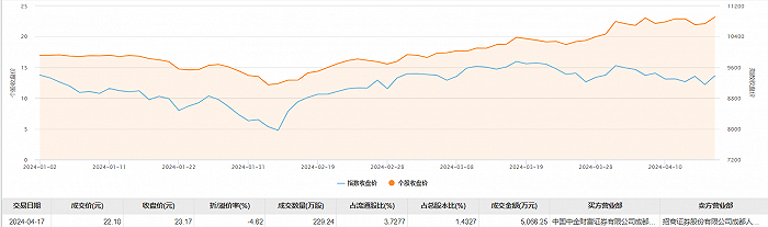 4月17日大宗交易成交229.24万股,成交额5066.25万元,占当日总成交额的46.93%,成交价22.1元,较市场收盘价23.17元折价4.62%。