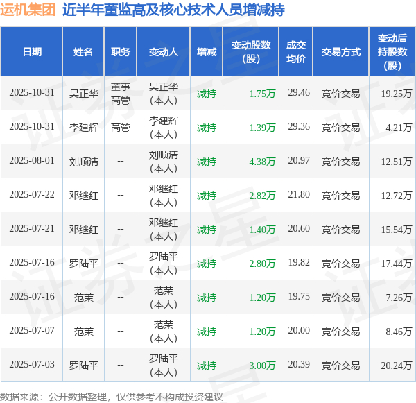 运机集团近半年内的董监高及核心技术人员增减持详情如下: