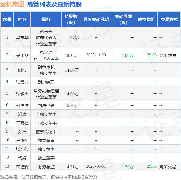 运机集团:11月12日高管吴正华、何洋洋减持股份合计2.94万股