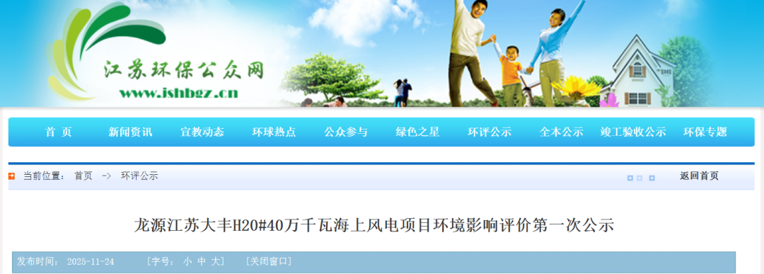 11月24日,江苏环保公众网发布《龙源江苏大丰H20#40万千瓦海上风电项目环境影响评价第一次公示》。