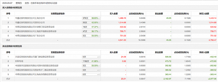 具体来看,机构买入9207元,卖出473.72万元,合计净卖出472.8万元。此外,华鑫证券上海分公司、华鑫证券深圳分公司分别买入1488.19万元、1014.68万元;兴业证券厦门建业路证券营业部、中国银河证券郑州南阳路证券营业部分别卖出506.58万元、392.82万元。