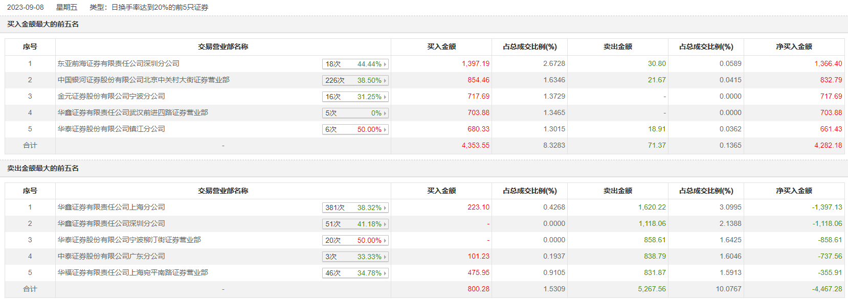 具体来看,东亚前海证券深圳分公司、中国银河证券北京中关村大街证券营业部分别买入1397.19万元、854.46万元;华鑫证券上海分公司、华鑫证券深圳分公司分别卖出1620.22万元、1118.06万元。