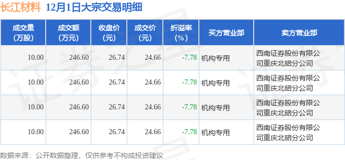 12月1日长江材料现4笔大宗交易 机构净买入986.4万元