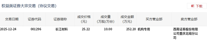 12月24日,长江材料大宗交易成交10万股,成交额252.2万元,占当日总成交额的1.49%,成交价25.22元,较市场收盘价27.71元折价8.99%。