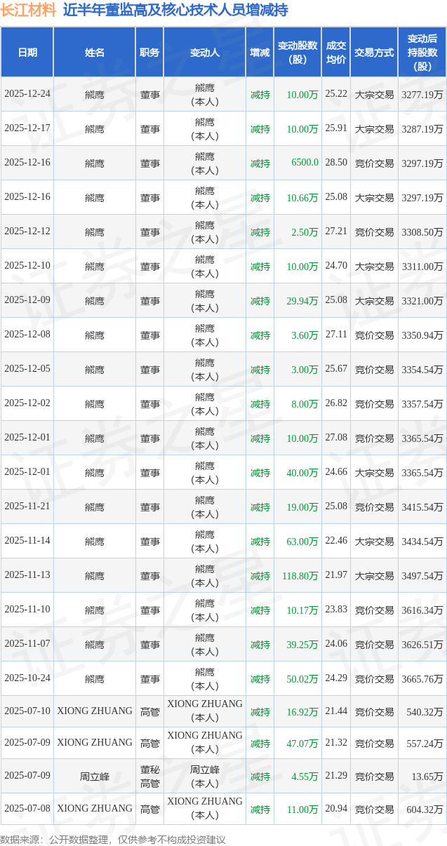 长江材料:12月24日高管熊鹰减持股份合计10万股