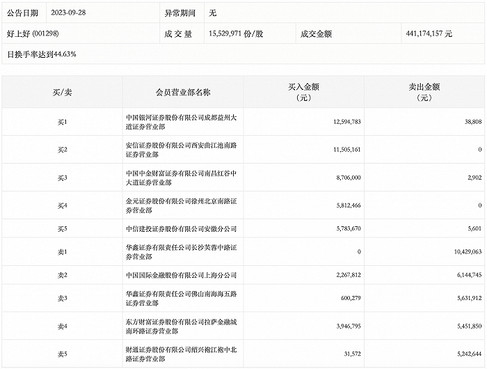 9月28日,好上好今日涨停,全天换手率达44.63%,振幅达5.69%。龙虎榜数据显示,营业部席位合计净买入1830.1万元。其中,中国银河证券成都益州大道证券营业部、安信证券西安曲江池南路证券营业部分别买入1259.48万元、1150.52万元;华鑫证券长沙芙蓉中路证券营业部、中国国际金融上海分公司分别卖出1042.91万元、614.47万元。