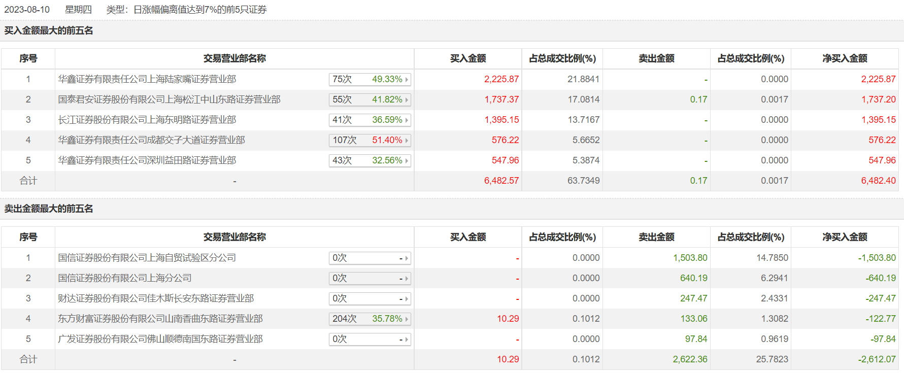 具体来看,华鑫证券上海陆家嘴证券营业部、国泰君安证券上海松江中山东路证券营业部分别买入2225.87万元、1737.37万元;国信证券上海自贸试验区分公司、国信证券上海分公司分别卖出1503.80万元、640.19万元。