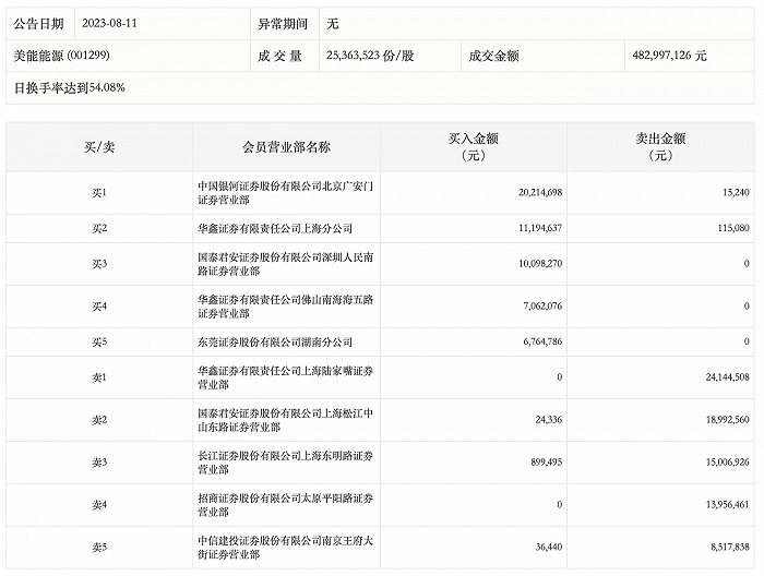 8月11日,美能能源今日涨停,全天换手率达54.08%,振幅达3.78%。龙虎榜数据显示,营业部席位合计净卖出2445.39万元。其中,中国银河证券北京广安门证券营业部、华鑫证券上海分公司分别买入2021.47万元、1119.46万元;华鑫证券上海陆家嘴证券营业部、国泰君安证券上海松江中山东路证券营业部分别卖出2414.45万元、1899.26万元。