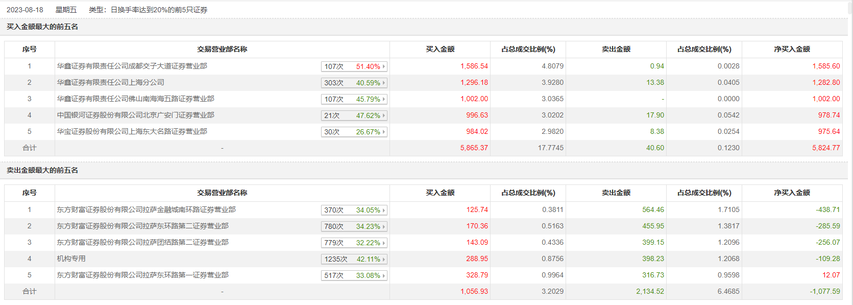 8月18日,美能能源今日涨停,全天换手率达36.85%,振幅达11.68%。龙虎榜数据显示,营业部席位合计净买入4747.18万元。其中,机构买入288.94万元,卖出398.23万元,合计净卖出109.28万元。此外,华鑫证券成都交子大道证券营业部、华鑫证券上海分公司分别买入1586.54万元、1296.18万元;东方财富证券拉萨金融城南环路证券营业部、东方财富证券拉萨东环路第二证券营业部分别卖出564.46万元、455.95万元。