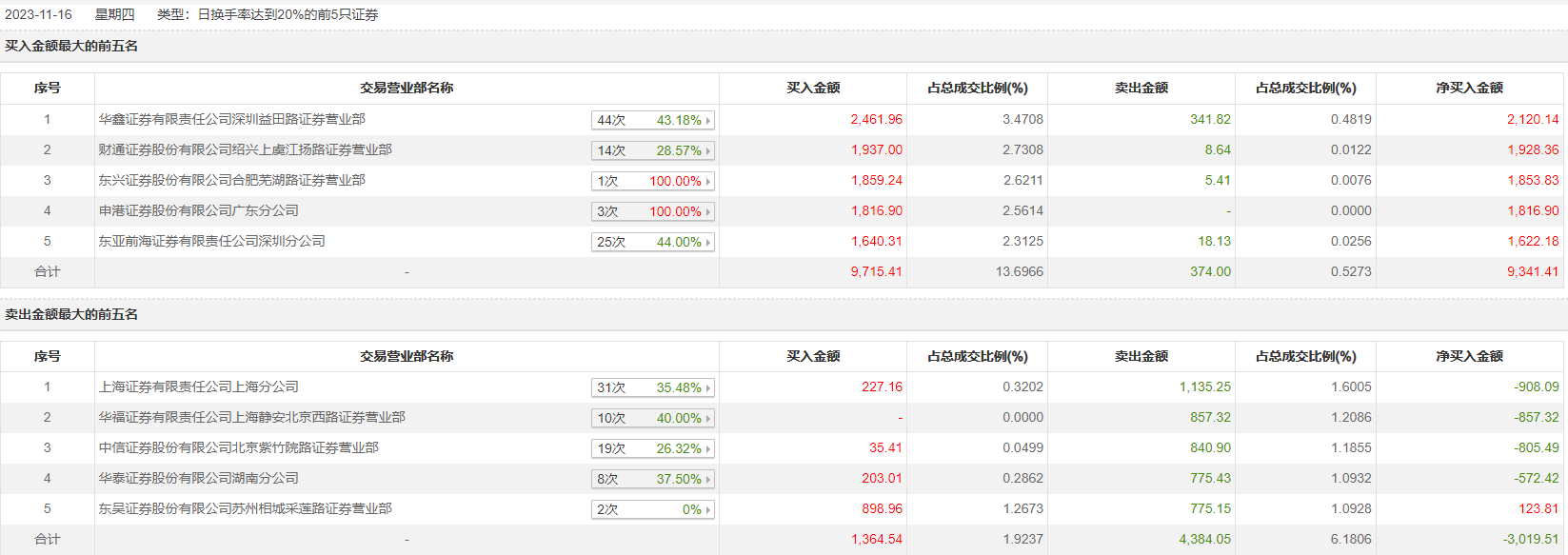 具体来看,华鑫证券深圳益田路证券营业部、财通证券绍兴上虞江扬路证券营业部分别买入2461.96万元、1937.00万元;上海证券上海分公司、华福证券上海静安北京西路证券营业部分别卖出1135.25万元、857.32万元。