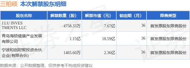 证券之星消息,根据市场公开信息整理,三柏硕(001300)于10月20日将有1.78亿股限售股份解禁,为公司首发原股东限售股份,占公司总股本72.84%。(本次数据根据历史公告整理得出,实际情况以上市公司最新公告为准)本次解禁后,公司已无限售股份。具体如下图所示: