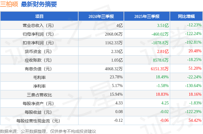 据证券之星公开数据整理,近期三柏硕(001300)发布2025年三季报。截至本报告期末,公司营业总收入3.51亿元,同比下降12.23%,归母净利润-460.02万元,同比下降122.24%。按单季度数据看,第三季度营业总收入1.05亿元,同比下降20.66%,第三季度归母净利润-1286.75万元,同比下降687.09%。本报告期三柏硕公司应收账款体量较大,当期应收账款占最新年报归母净利润比达385.22%。