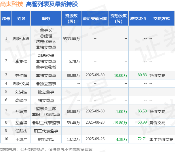 证券之星消息,根据10月30日市场公开信息、上市公司公告及交易所披露数据整理,尚太科技(001301)最新董监高及相关人员股份变动情况:2025年10月29日公司监事孙跃杰共减持公司股份1.0万股,占公司总股本为0.0038%。变动期间公司股价上涨6.71%,10月29日当日收盘报88.6元。