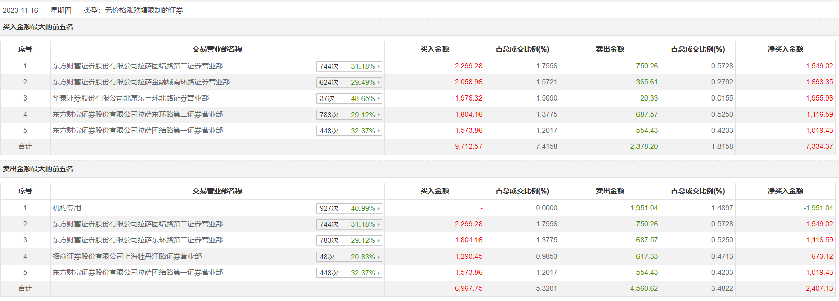 具体来看,机构合计净卖出1951.04万元。此外,东方财富证券拉萨团结路第二证券营业部、东方财富证券拉萨金融城南环路证券营业部分别买入2299.28万元、2058.96万元;东方财富证券拉萨团结路第二证券营业部、东方财富证券拉萨东环路第二证券营业部分别卖出750.26万元、687.57万元。