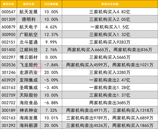 今日龙虎榜机构活跃度较高,买入方面,商业航天人气股航天发展今日涨停,获三家机构大幅买入4.82亿。广联航空获三家机构买入1.32亿,北斗星通获三家机构买入9283万。存储芯片概念股德明利获三家机构买入2.05亿。