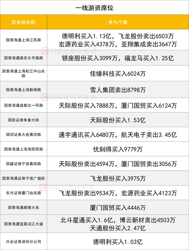 一线游资活跃度较高,存储芯片概念股德明利获两家游资(国泰海通证券上海江苏路、兴业证券深圳分公司)分别买入1.13亿、1.03亿。航天电子遭中国银河证券大连黄河路营业部大幅卖出3.45亿。