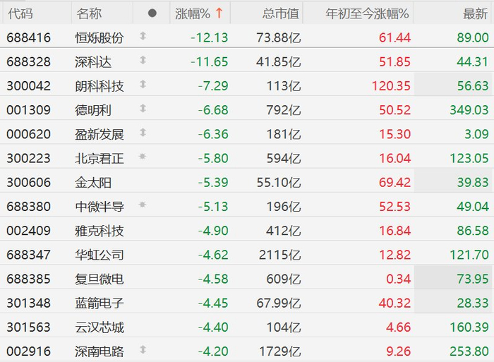 格隆汇3月19日|A股市场存储芯片股集体下跌,其中,恒烁股份跌超12%,深科达跌超11%,朗科科技跌超7%,德明利、盈新发展跌超6%,北京君正、金太阳、中微半导跌超5%,雅克科技、华虹公司、复旦微电、蓝箭电子、云汉芯城、深南电路跌超4%。