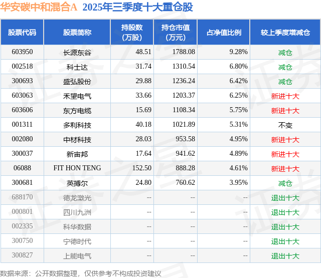 华安碳中和混合A的前十大重仓股如下: