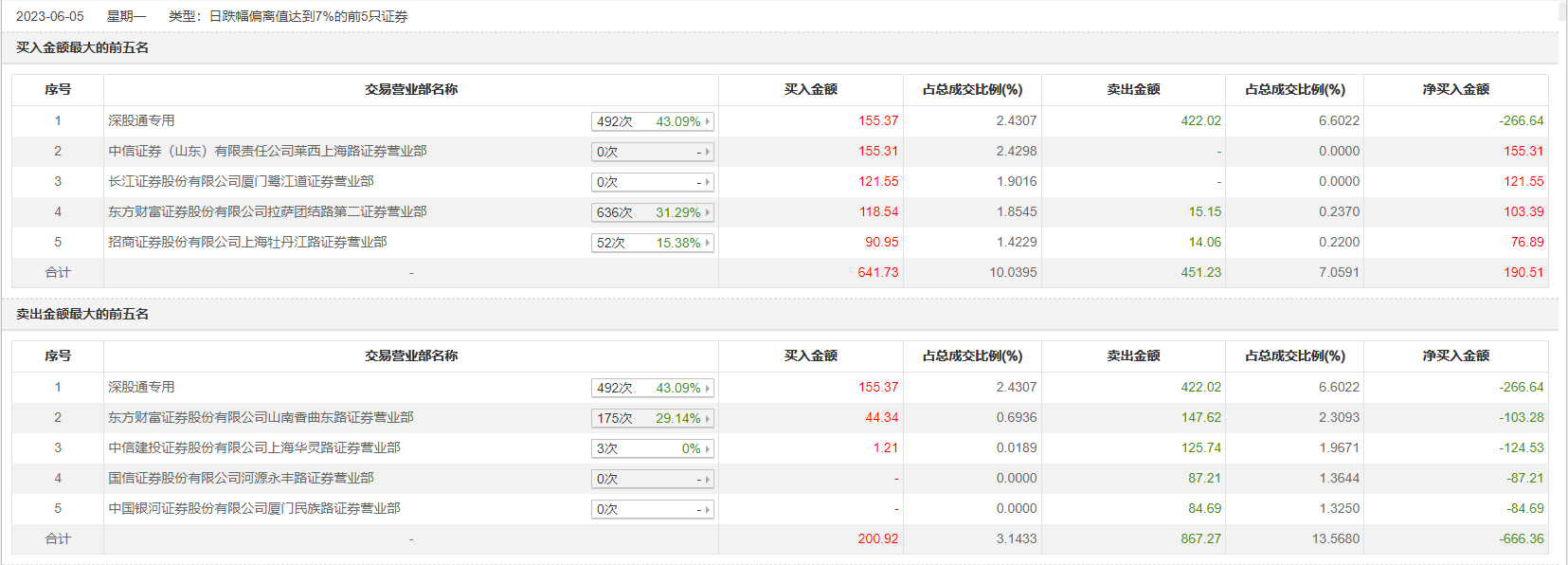 具体来看,深股通专用、东方财富证券山南香曲东路证券营业部分别卖出422.02万元、147.62万元;深股通专用、中信证券(山东)莱西上海路证券营业部分别买入155.37万元、155.31万元。