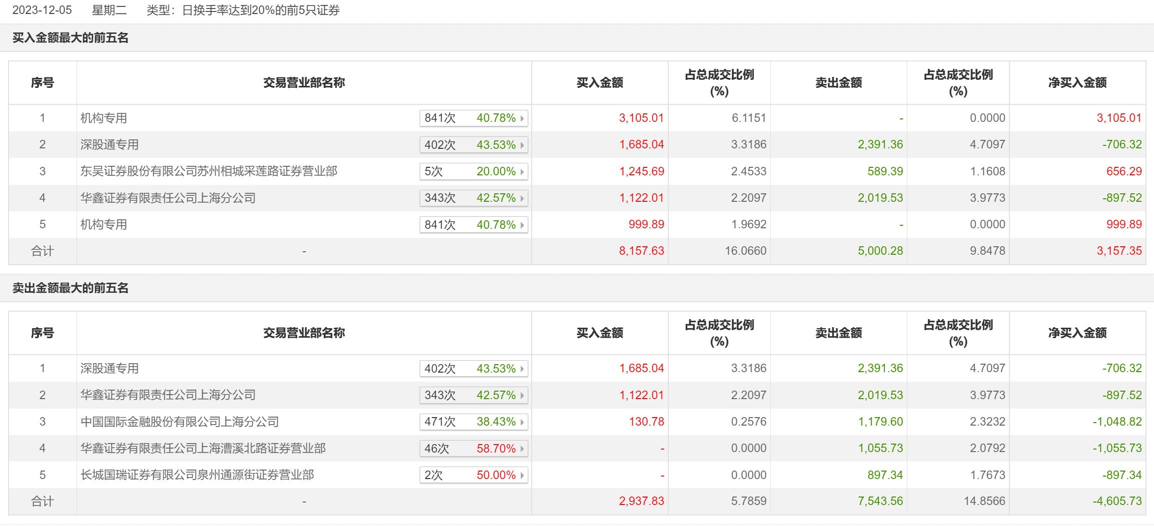 12月5日,亿道信息今日涨停,全天换手率达30.86%,振幅达9.5%。龙虎榜数据显示,营业部席位合计净买入155.46万元。其中,机构合计净买入4104.9万元。此外,深股通专用、东吴证券苏州相城采莲路证券营业部分别买入1685.04万元、1245.69万元;深股通专用、华鑫证券上海分公司分别卖出2391.36万元、2019.53万元。