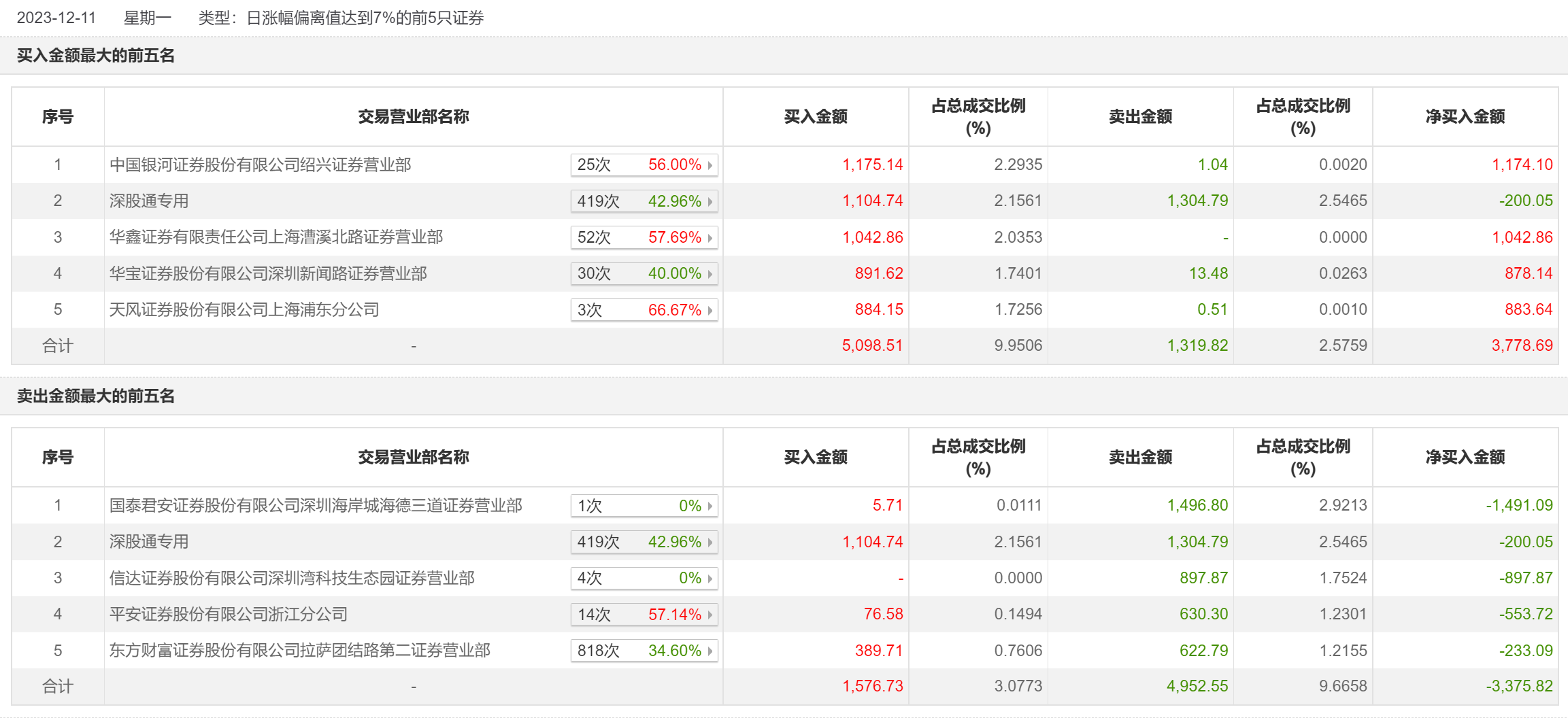 12月11日,亿道信息今日涨停,龙虎榜数据显示,上榜营业部席位全天成交1.05亿元,占当日总成交金额比例为20.57%。其中,买入金额为5570.5万元,卖出金额为4967.58万元,合计净买入602.92万元。