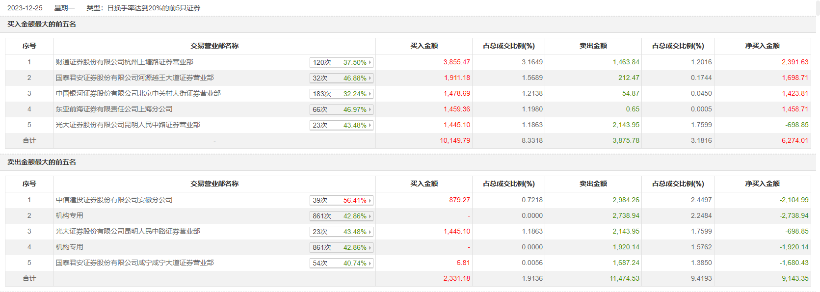 12月25日,亿道信息今日涨8.28%,全天换手率达50.65%,振幅达11.73%。龙虎榜数据显示,营业部席位合计净卖出2170.49万元。其中,机构合计净卖出4659.08万元。此外,财通证券杭州上塘路证券营业部、国泰君安证券河源越王大道证券营业部分别买入3855.47万元、1911.18万元;中信建投证券安徽分公司、光大证券昆明人民中路证券营业部分别卖出2984.26万元、2143.95万元。